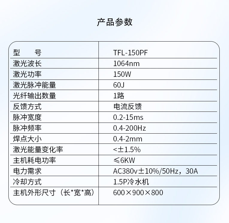 通發激光TFL-150PF光纖激光焊接機,采用能量反饋控制模式,能量較穩定,光纖傳輸光束質量好,適合0.5mm以下金屬不銹鋼板材的精密激光焊接,是批量五金產品中小功率焊接專用機型。