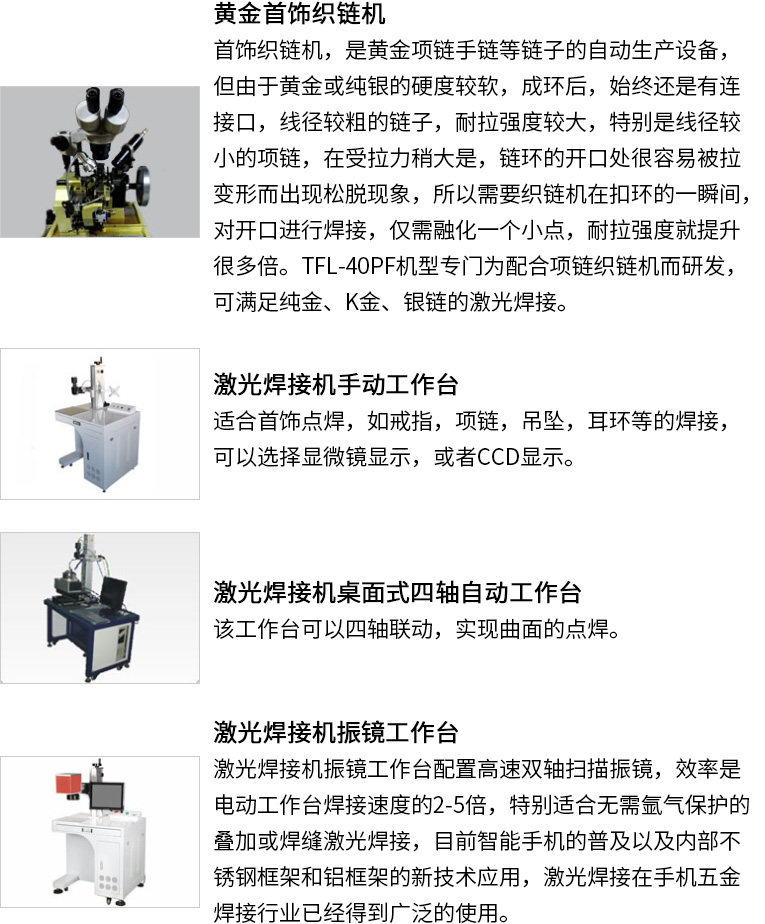通發激光研發針配合黃金織鏈機、K金制鏈機、首飾制鏈機的TFL-80PF自動激光焊接機,焊接機采用能量反饋技術,光點穩定,能量強勁,實現一環一焊的功能,確保金鏈的耐拉強度。本激光焊機實現了水冷一體的小型化結構。適用于各種生產場所。