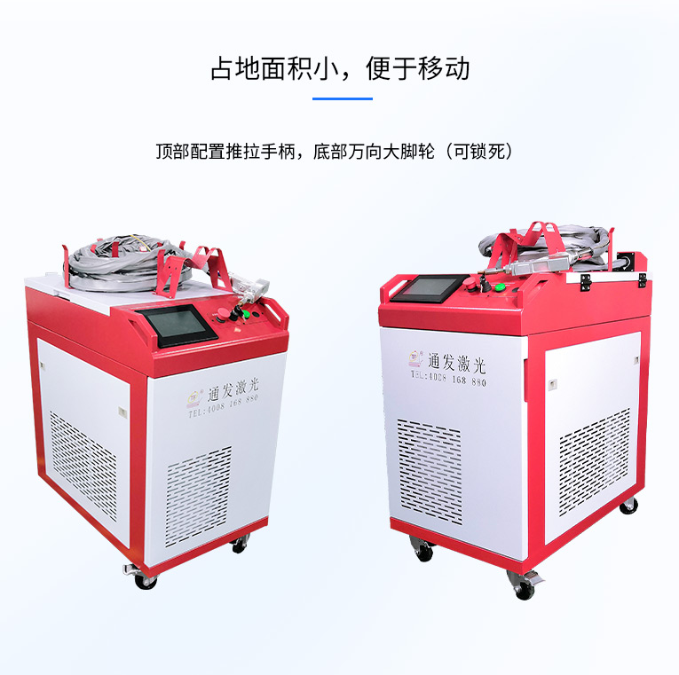 通發激光一體式手持式激光焊接機,用手持式焊接槍替代以前固定光路,手拿焊接,靈活方便,焊接距離更長,克服工作臺空間的局限性,工件尺寸不統一時無法自動焊接的情況下使用。主要針對大型工件、固定位置如內直角、外直角、平面焊縫焊接、焊接時熱影響區域小,變形小、而且焊接深度大,焊接牢固。是遠距離焊接大工件的較為靈活的全新的焊接工藝。